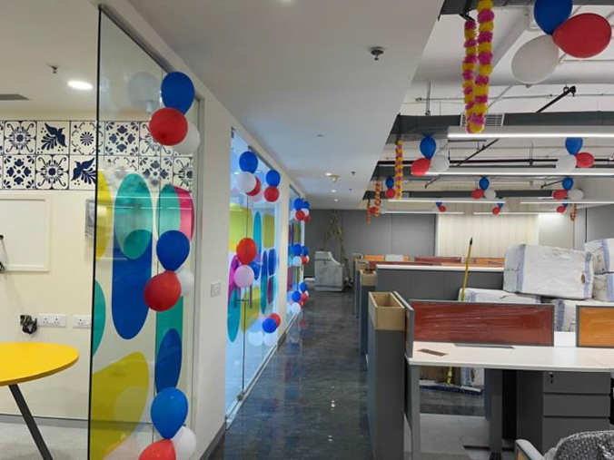 Aditya Birla Group Office Interiors, a vibrant corporate redesign, in Noida’s humid subtropical climate features colorful murals, linear LED lighting, open workstations, and biophilic elements like plants for comfort and functionality. Arofe Build & Design Pvt. Ltd. provided turnkey execution, including interior design, material installation, and festive accents, ensuring seamless delivery and compliance. This project delivers a modern, collaborative workspace with contemporary style, enhancing employee satisfaction in the NCR.